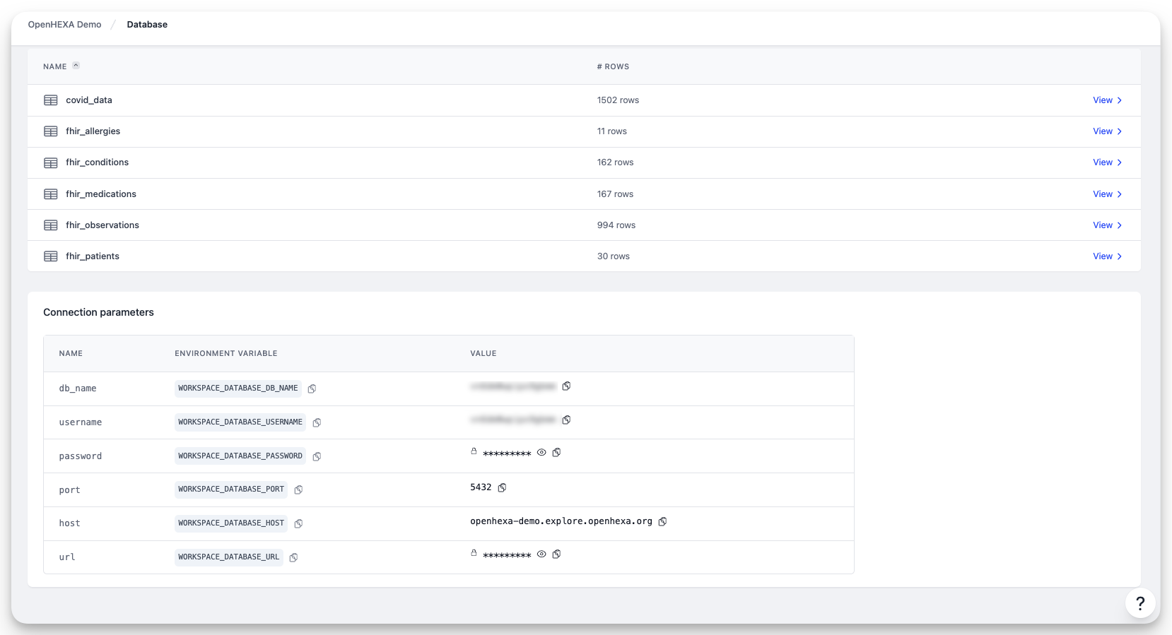 You can also use your OpenHEXA workspace database as a data source in data visualization and BI tools like Tableau or Power BI. Simply copy the connection parameters from the database page and paste them into your tool.